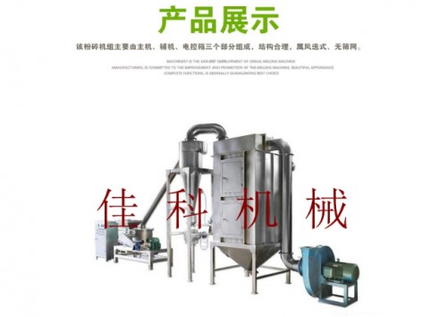 300目大豆除塵粉碎機經進料口螺旋送料器,將物料送入機體與導流圈之間的粉碎室,在粉碎室內被高速旋轉的刀片沖擊下,使物料甩向固定在機體上的齒圈,造成撞擊、剪切,以及物料與刀片、齒圈間的相互碰撞、摩擦、剪切進行交替粉碎。粉碎后的物料,在負壓氣流的拉力作用下,小粉粒克服自重,隨氣流越過導流圈,進入分級室。分級葉輪由葉片組成,高速旋轉的葉片產生與負壓相反的離心力,沉入葉道內的粉粒同時受到負壓氣流的向心力和粉粒自重及葉輪產生的離心力的作用,粉粒中大于臨界直徑(分級粒徑)的顆粒因質量大,被甩回粉碎室繼續粉碎,小于臨界直徑的顆粒經排粉管進入旋風收集器經排料閥排出。分級葉輪的旋轉速度越高,分級的粉粒越細,調正分級葉輪的旋轉是控制粉粒大小的決定因素。