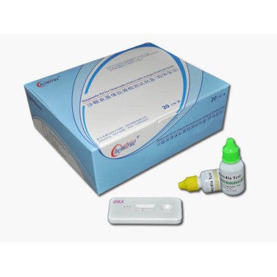 沙眼衣原體抗原檢測試劑盒(膠體金法)系用抗衣原體脂多糖單克隆抗體和羊抗鼠IgG多克隆抗體分別固定于固相硝酸纖維素膜,并和膠體金標記的另一抗衣原體脂多糖單克隆抗體及其他試劑和原料制成,應用膠體金免疫層析技術,采用雙抗體夾心的形式建立的衣原體檢測方法,用于女性宮頸和男性尿道中沙眼衣原體抗原的檢測。
