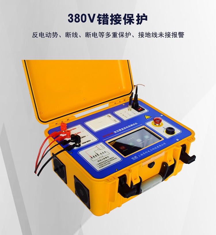 3. 儀器具有380V錯接保護(hù)、反電動勢保護(hù)、斷線保護(hù)和斷電保護(hù)等多種保護(hù)功能,以及接地線未接報警功能。