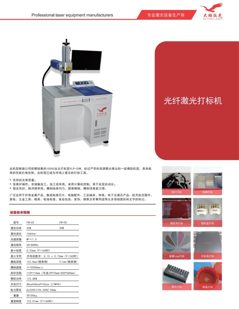 激光加工為一體的高新技術工廠,致力于激光加工技術支持、服務和咨詢,為客戶節約成本量身打造設備。本公司的主要產品包括光纖激光打標機、端面泵浦激光打標機、半導體側泵激光打標機、YAG激光打標機、CO2激光打標等類型十幾種型號的工業激光設備,廣泛應用于電子、IC芯片、電工電器、照明燈具、珠寶首飾、五金工具、衛浴潔具、儀器儀表、汽摩配件、手機通訊部件、模具、精密機械、醫器械、IT數碼金屬外殼、軍工航空部件、服裝皮革、工藝禮品、廣告裝飾、模型、炊具餐具、廚具等行業。