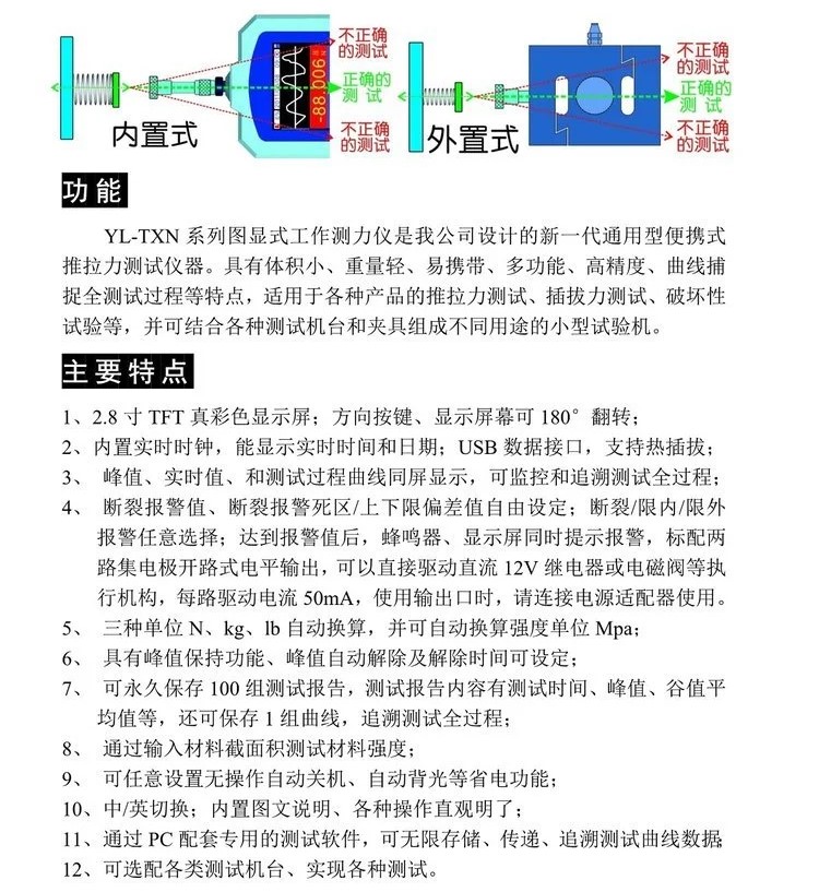 YL-TXN系列測力儀表是我司新開發的便攜式推拉負荷測試儀器,具有體積小、重量輕、容易攜帶、多功能、高精度等特點,適用于各種產品的推拉負荷測試,插拔力測試、破壞試驗等,并可結合各種機臺和夾具組成不同用途的小型實驗機。