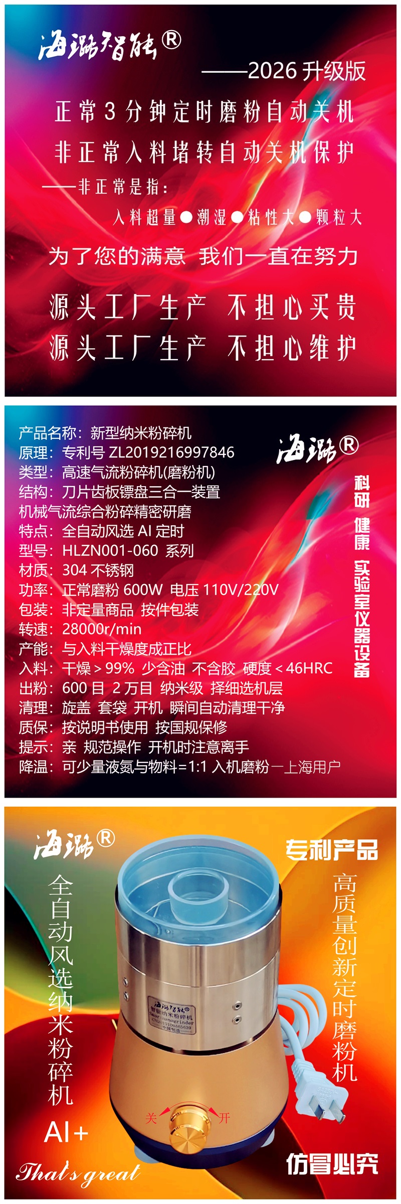 更新信息 快采購網供應商東莞海璐智能電氣有限公司供應好看又好用真超細磨粉機高質量科研全自動風選定時海璐納米粉碎機,為您提供詳細的產品報價、參數、圖片等商品信息,本產品于2025-10-04 15:28更新,主要更新內容為:產品類別、產品參數、產品價格、產品圖片等信息。如需進一步了解好看又好用真超細磨粉機高質量科研全自動風選定時海璐納米粉碎機詳細信息,請與廠家直接聯系,并說明是在快采購網看到這條商機的。