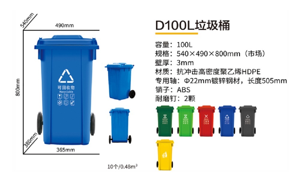 重慶長壽100L居民小區生活垃圾四色分類環衛垃圾桶——賽普D100L垃圾桶采用高密度聚乙烯(HDPE)材料一次注塑而成,堅固耐用,質量可靠,廣泛適用于多種場合。如果您正好在尋找一款使用壽命長、不易變形、成本低廉的垃圾桶,不要錯過這款垃圾桶。