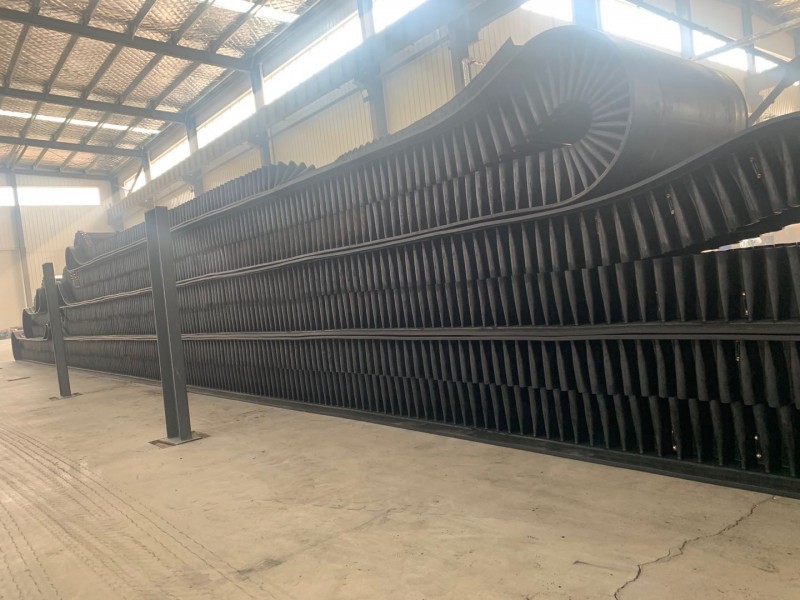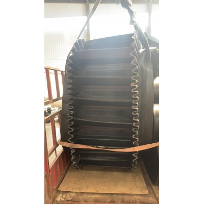 結構:擋邊輸送帶由基帶 裙邊 橫隔板三部分組成。基帶可分為分層織物輸送帶 鋼絲繩芯輸送帶或金屬網芯輸送帶等;擋邊分為SW型;隔板分為TTC型等