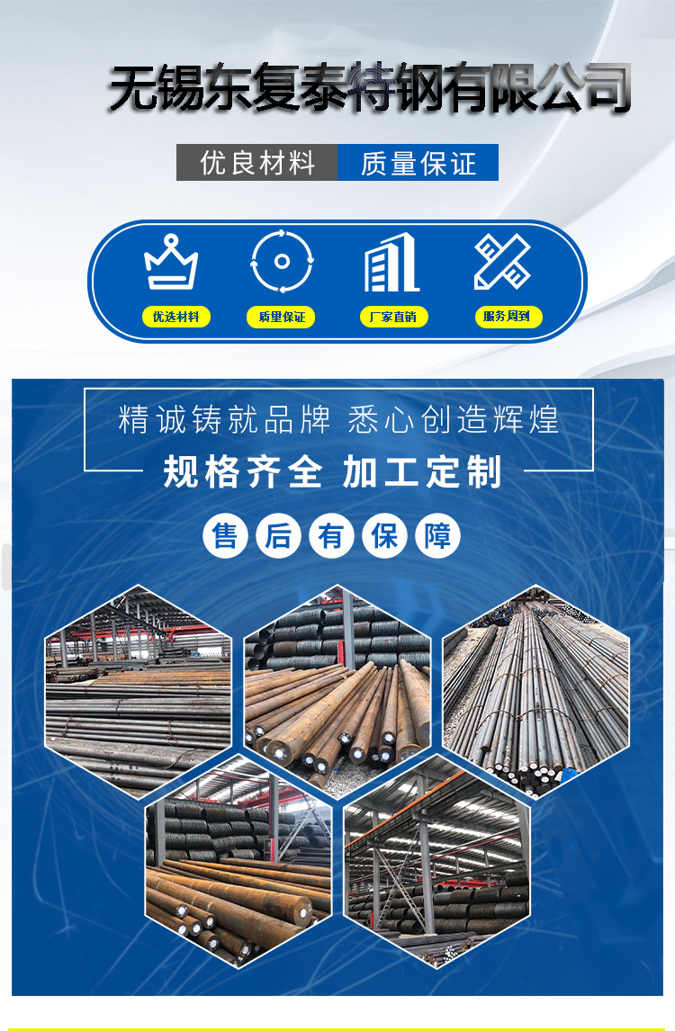無錫東復泰主營45#圓鋼、35#圓鋼、20#圓鋼、10#圓鋼、A3圓鋼、Q235圓鋼、A105圓鋼、T10圓鋼、20Cr圓鋼、40Cr圓鋼,16Mn圓鋼、Q345B圓鋼、Q345D圓鋼、Q345E圓鋼、15CrMo圓鋼、20CrMo圓鋼、30CrMo圓鋼、4130圓鋼、35CrMo圓鋼、42CrMo圓鋼、4140圓鋼、42CrMoB7圓鋼、12Cr1MoV圓鋼、38CrMoAl圓鋼、27SiMn圓網、65Mn彈簧鋼、55Si2Mn彈簧鋼、60Si2Mn彈簧鋼、60Si2Cr彈簧鋼、60Si2CrV彈簧鋼、50CrVA彈簧鋼、GCr15軸承鋼、GCr15SiMn軸承鋼、G20CrNiMo軸承鋼、G20CrNi2Mo軸承鋼、Cr12圓鋼、Cr12MoV圓鋼、CrWMn圓鋼、9CrSi圓鋼、3Cr2W8V圓鋼、20CrMnTi圓鋼、30CrMnTi圓鋼、20CrNiMo圓鋼、SAE8620H圓鋼、40CrNiMo圓鋼,45CrNiMoV圓鋼、25Cr2MoV圓鋼、25Cr2Mo1V圓鋼、12CrNi3圓鋼、18Cr2Ni4WA圓鋼、20Cr2Ni4圓鋼、20CrNi2Mo圓鋼、5CrNiMo圓鋼、5CrMnMo圓鋼、17CrNiMo6圓鋼、
