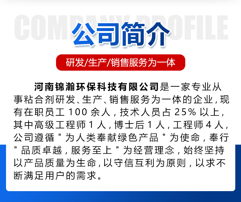 公司簡介 河南錦瀚環保科技有限公司——是一家專業從事粘合劑研發、生產與銷售于一體的綜合性 的企業,公司遵循"為人類奉獻綠色產品"為使命,奉行"品質卓越,服務至上"為經營理念,并以"打造粘合劑國內品牌"為發展目標,始終堅持以產品質量為生命,以誠信互利為原則,以求不斷滿足用戶的需求。我們是一家集研發、生產、銷售、服務為一體的綜合性企業,企業文化理念:誠信、創新、卓越、共享...