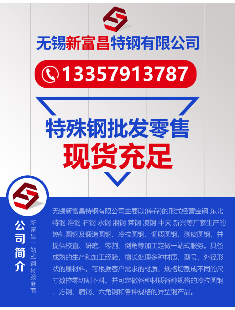 公司簡介   無錫新富昌特鋼有限公司專業經營各種進口、國產合金鋼、不銹鋼、碳鋼管材、板材、棒材、型材、管道配件等,為石油、化工和電力行業提供配套(管件)材料。是中國石油化工股份有限公司物資裝備部 的中國石化合金鋼管配送中心,中國石油天然氣集團公司一級供應網絡企業。常年經銷電廠、電站鍋爐耐高溫結構用鋼(12Cr1MoV鋼板;1Cr6Si2Mo鋼板),石油化工用耐高溫板(15CrMo鋼板;15CrMoR中溫容器板);耐腐蝕鋼,耐 腐蝕鋼(ND鋼)09CrCuSb、耐候鋼板09CuPcrNi-A、Corten-B鋼板;20G高壓鍋爐管,15CrMoG高壓鍋爐管,12Cr1MoVG高壓鍋爐管,美標A106B鋼管,SA210C鋼管,WB36鋼管,鋼研102磁...