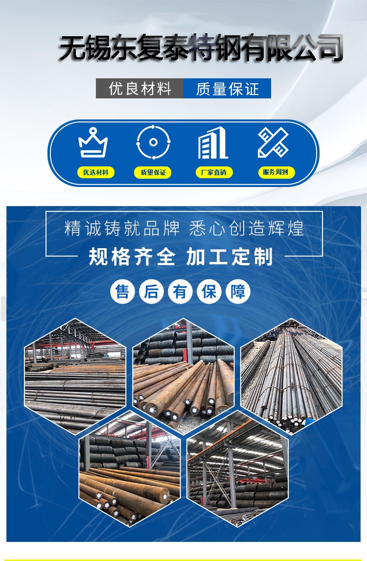 公司簡介   無錫東復泰特鋼有限公司地處華東地區很大的鋼鐵貿易集散地 — 無錫,是一家大型鋼材加工、銷售和配送的企業, 主要以CrMo(鉻鉬系列)、CrNiMo(鉻鎳鉬系列)、CrMnMo(鉻錳鉬系列)、碳素鋼( A105、10#、20#、25#、35#、Q345B)軸承鋼(GCr15,GCR15SiMn);易切削鋼(1215,12L14,1144);彈簧鋼(65Mn,60Si2MnA,50CrVA)螺栓鋼 (25Cr2MoV、25Cr2Mo1V、B16、20Cr1MO1VTiB 、20Cr1Mo1VNbTiB、2Cr12NiMO1W1V 、38CrSi)耐熱鋼(15CrMo ,12Cr1MoV, 1Cr6Si2Mo) (熱作模具鋼,冷作模具鋼,塑料模具等等)銷售東北特鋼、大冶特鋼、興澄特鋼、撫順特鋼、西寧特鋼、巨能特鋼、淮鋼、...