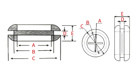 產品編碼規格(mm)A內徑B開孔C外徑D卡槽E總厚包裝/只