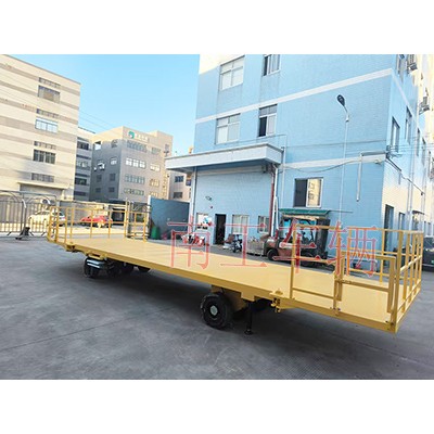 10噸移動拖車底盤 全掛式平板拖車帶護欄南工車輛長期非標訂制,平板拖車用于工廠、碼頭、港口、機場、倉庫等場區短途周轉運輸,本款拖車帶角鎖,適用于各類箱體簡易房車移動方艙運輸。