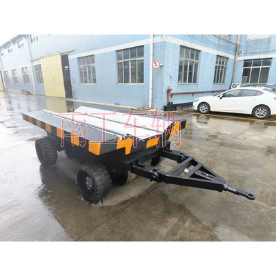5.緩沖式牽引架有效緩解起步或制動時牽引車與平板車之間的沖擊力,有效避免部件損壞,以及運載貨物的碰撞與損傷,前排車輪左右回轉角度為180度,大回轉角度便于小半徑轉向,操作簡單方便;