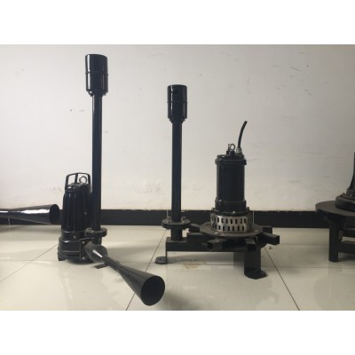 通過潛水泵產(chǎn)生的水流經(jīng)過噴嘴形成高速水流,在噴嘴周圍形成負(fù)壓 吸入空氣,經(jīng)混合室與水流混合,在喇叭形的擴(kuò)散管內(nèi)產(chǎn)生水氣混合流, 高速噴射而出,夾帶許多氣泡的水流在較大面積和深度的水域內(nèi)渦旋攪 拌,完成曝氣,并且其軸功率不隨潛沒深度的變化而變化,進(jìn)氣量可以調(diào) 節(jié)。正因?yàn)槿绱耍淞魇狡貧鈾C(jī)可以在水位變化較大的池中應(yīng)用