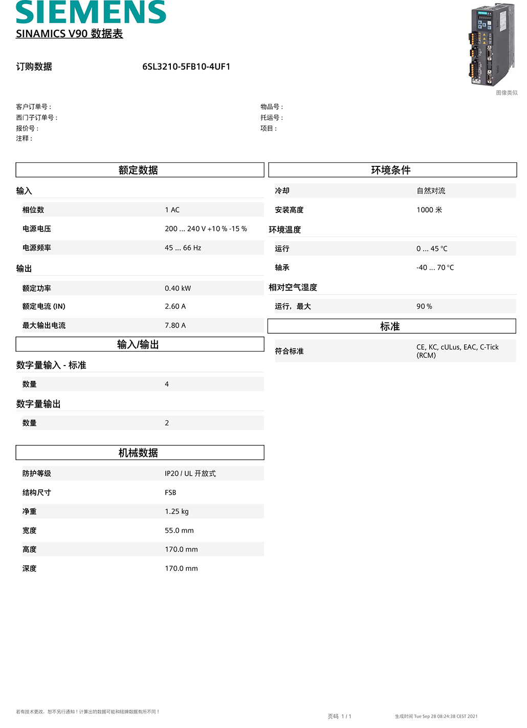 SINAMICS V90,含 PROFINET 輸入電壓: 200-240 V 1 相/三相交流 - 15 %/+ 10 % 5.0 A/3.0 A 45-66 輸出電壓:0 – 輸出 2.6 A 0-330 Hz 電機:0.4 kW 防護等級:IP20 尺寸 B, 55x170x170(寬x高x深)