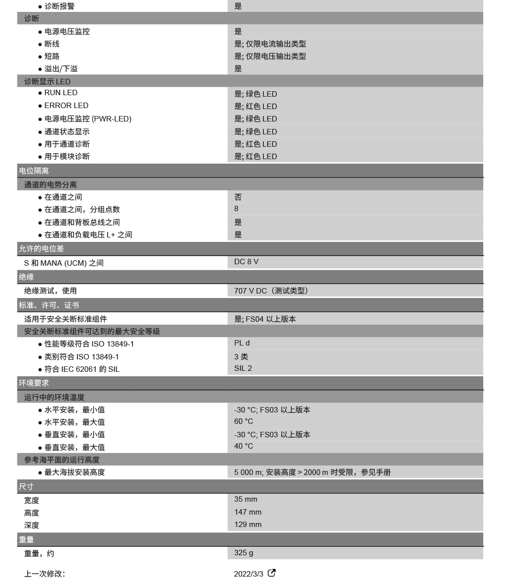 SIMATIC S7-1500, 模擬量輸出模塊 模擬輸出 8xU/I 高速型,16 位分辨率 , 精度 0.3%, 8 通道,分成組,每組 8, 診斷;替換值 8 通道以 0.125ms 過采樣; 模塊支持 安全 斷開負載組 至 SIL2 根據 ENIEC 62061:2021 和 Category 3 / PL d 根據 EN ISO 13849-1:2015。 供貨范圍內包含 饋電元素,屏蔽支架 和屏蔽端子: 前連接器(螺釘型接線端子 或直插式)單獨訂貨
