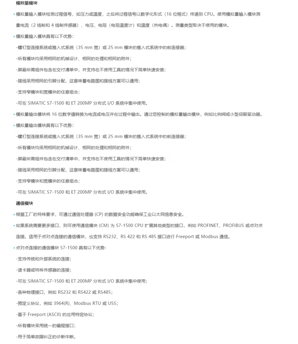 S7-1500系列的CPU自帶面板,能支持診斷,調試,維護,IP地址分配,趨勢圖顯示,讀取程序循環時間等功能;同時具有多功能型I/O模塊,可以對產品線進行優化,方便進行選型和備件;