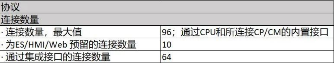 通過手冊參數可以看到這款CPU 多有 96 個協議通信資源,但是對于 CPU 集成的 PN 接口多只有 64 個通信資源,同時有 10 個協議通信資源已經作為預留(編程軟件/HMI/WEB)無法再給其它的協議使用。