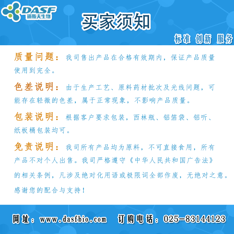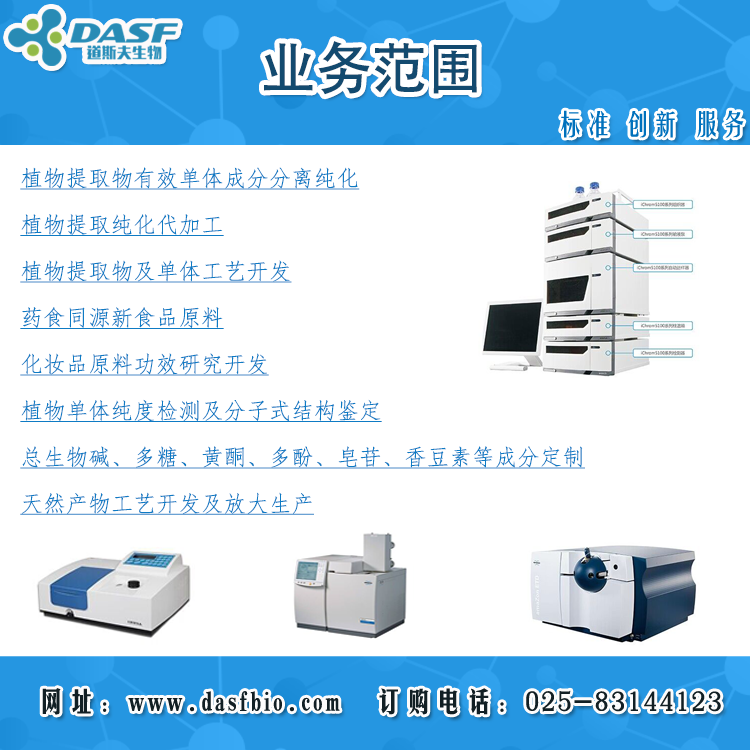 公司簡介 道斯夫生物(南京)坐落于南京六合化工園,專業從事高純度中草藥藥用活性成分的分離純化及工藝開發,是一家集研發、生產、銷售于一體的科技型企業。旨在提升中藥質量標準、檢測中藥活性物質成分目標含量及分離純化中草藥單體成分,包括中國藥典標定成分及各民族藥活性成分,滿足原料藥單體成分市場的需求。公司聯合南京農業大學、中國藥科大學及南京中醫藥大學共同開展天然產物分離純化業務,長期為國內外各大高等院校、研究所及企事業單位建立穩定的供貨源。本公司所提供的各種化學對照品、中藥標準品已遠銷歐、美、日、韓、印等國際市場,并得到眾多客戶與行業同仁的好評和贊譽。公司相...